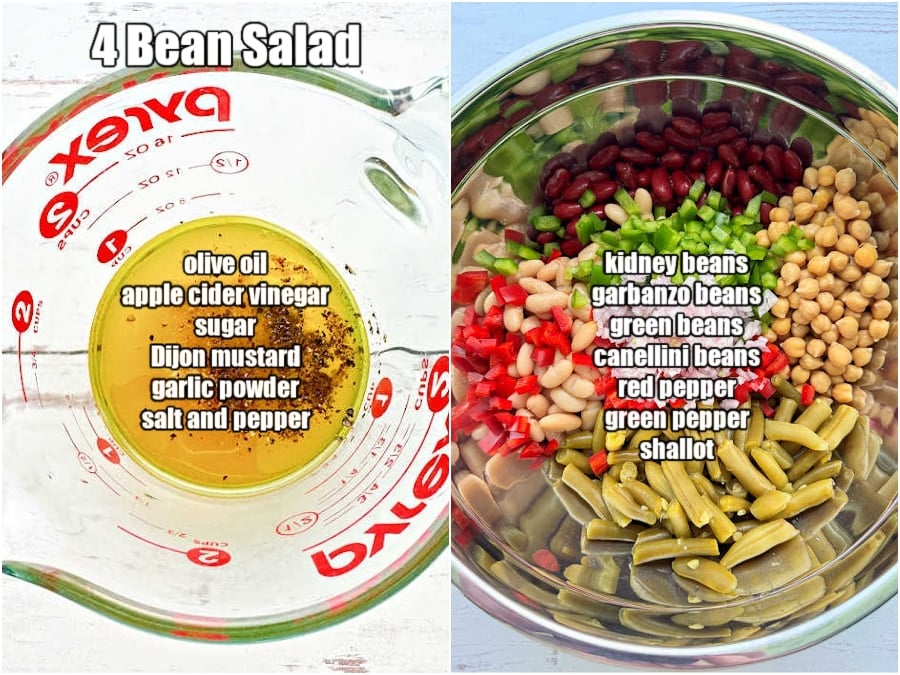 4 Bean Salad is a nutritious salad that can be made ahead. Economical, packed with protein and fiber, it’s a perfect side dish for picnics and potlucks.