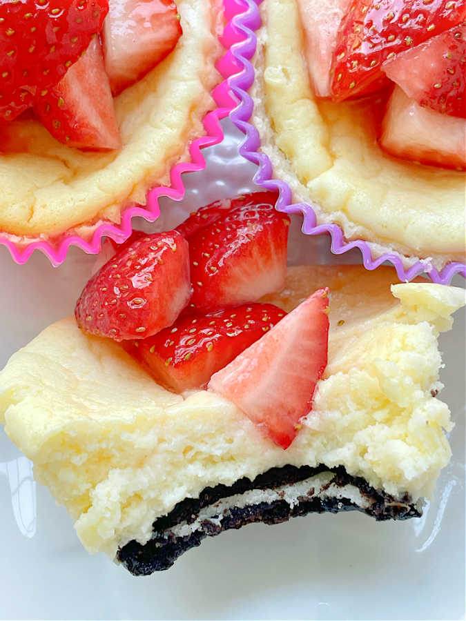 Chop the strawberries and set aside. Place a whole Oreo cookie in the bottom of each silicone baking cup. With a hand or stand mixer, beat together the cream cheese and sugar. Add in the egg and vanilla and beat until smooth. Melt the white chocolate in the microwave. Add it to the cream cheese mixture and beat until well combined.