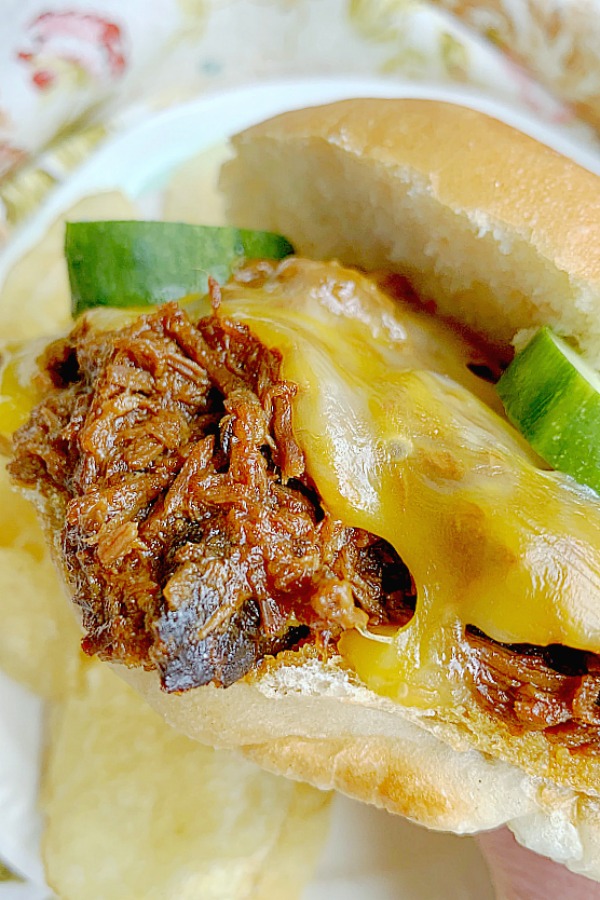 It is pulled pork but with beef. Any tougher cut of beef that you would use for pot roast works for this recipe. The slow cooker breaks down a tougher cut with ease. This beef requires minimal effort. Simply season the beef, set the slow cooker to LOW for 8 – 10 hours and walk away. Shred the beef. Add your favorite barbecue sauce. And let it cook some more. Serve it on buns with cheddar cheese and some pickle slices. It is so good! And perfect for football season and tailgating especially.