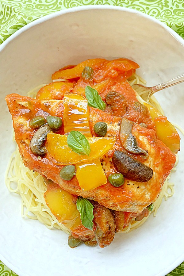 Cacciatore means “hunter” in Italian. Likely the original version of this dish included rabbit instead of chicken. Hunters needed a simple and filling stew to keep them going. This Chicken Cacciatore filled with lean chicken and lots of fresh vegetables is most definitely a satisfying dinner to feed your family.