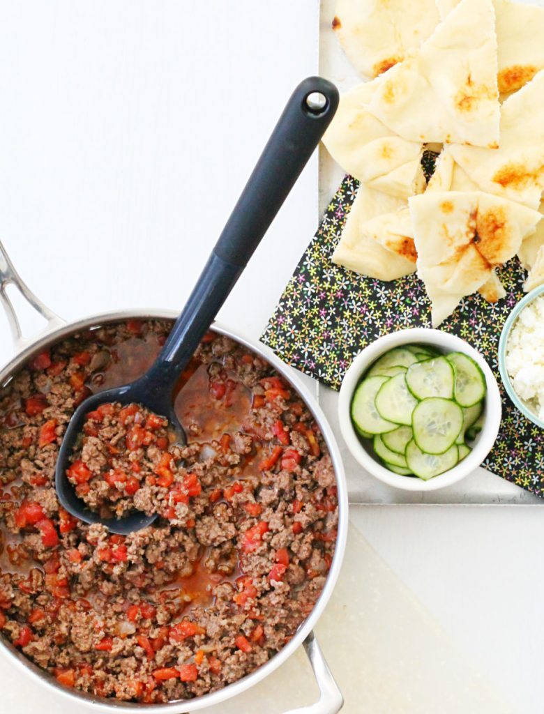 As the Spring season draws near we are getting closer toward grilling weather, meaning we can store away our slow cookers and soup pots. But not before we make this delicious and hearty yet still light and nutritious Gyro Stew! It’s everything you love about a traditional gyro wrap deconstructed in bowl form – ground lamb and beef are browned together with onion and garlic, seasoned with salt, oregano and marjoram and stewed together with plenty of juicy tomatoes and a splash of red wine. It’s served with quick pickled cucumbers, feta and flat bread for a complete meal that will transport you to the Mediterranean, even on a busy weeknight.