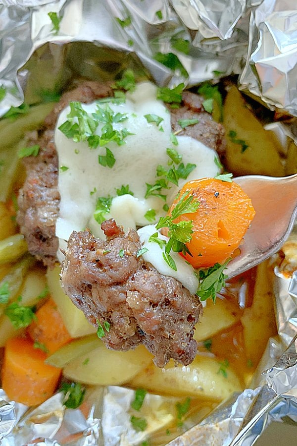 I recommend not grilling these foil packets over direct heat. Indirect heat is the way to go to ensure the potatoes and carrots are cooked evenly. Grill the foil packets over indirect or medium-low heat for about 40 – 45 minutes. Again, you want the beef to be cooked to a safe eating temperature of 160 degrees F. And you want the potatoes and carrots to be fork tender.
