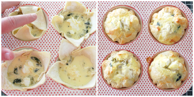 Once each quiche is filled, gently fold the four corners over the top of the filling. Place pans on center rack of oven and rotate once during the middle of baking time. They will come out golden and puffy, ready to enjoy!