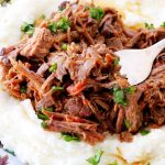 - Remove the pot from the oven. Shred the beef, put the lid back on and continue to cook for one more hour. Serve the beef and juices over provolone cheesy grits.
