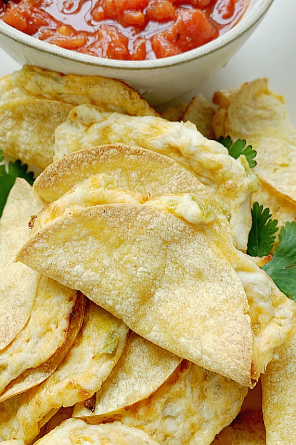 Probably the most time consuming part of this recipe is cutting the corn tortillas to size. Purchase thin yellow corn tortillas. Then use a water glass, about 3 inches in diameter, as your guide to trim each tortilla into a smaller circle. Cut the leftover corn tortillas scraps and use them as topping for chicken tortilla soup.
