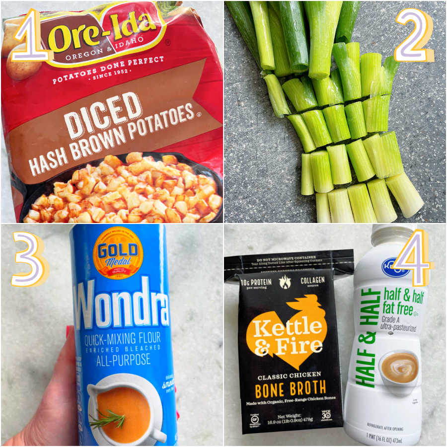 This is an easy recipe that uses just a few simple ingredients to create a comforting bowl of potato soup that everyone loves. Frozen hash browns combine with green onions, salt and pepper. Raw potatoes can be substituted. But I love the convenience of a bag of cubed hash browns. You won’t know the difference once it is cooked!