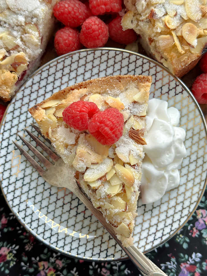 I took my favorite original recipe for a single layer strawberry cake and re-imagined it. This cake works well made with frozen raspberries, so you can enjoy it any time of year. But you can certainly use fresh when raspberries are in peak season. This is a fluffy almond cake with a tender crumb. It’s bursting with raspberry flavor and topped with crunchy sliced almonds and a sprinkling of sugar. Because it’s baked in a springform pan, you can put it on a fancy cake plate or platter for entertaining – like wedding or baby showers. Garnish it with fresh raspberries and a side of whipped cream. Or dust it with powdered sugar right before serving.