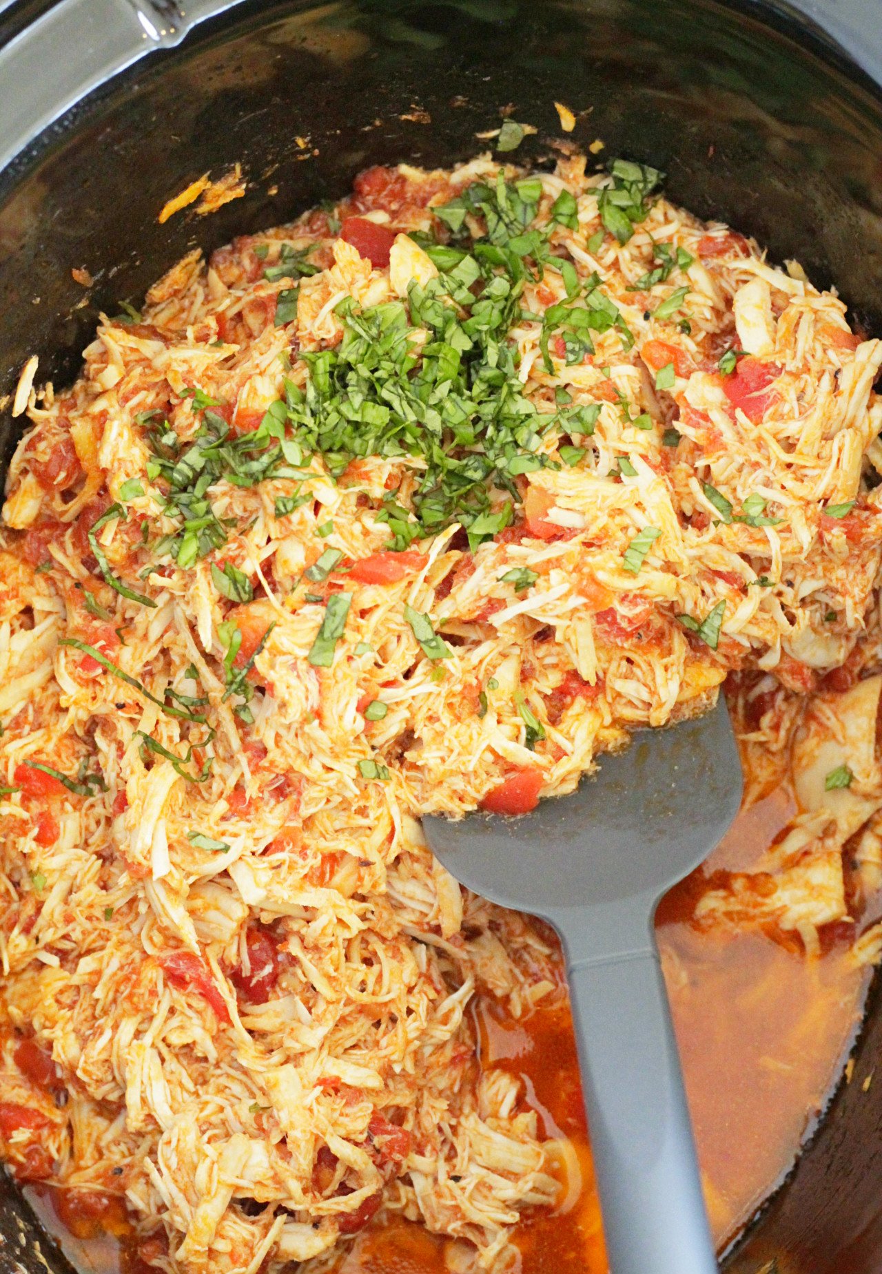 - Put the lid on and cook on LOW for 6 hours. Shred the chicken and turn the slow cooker to WARM.