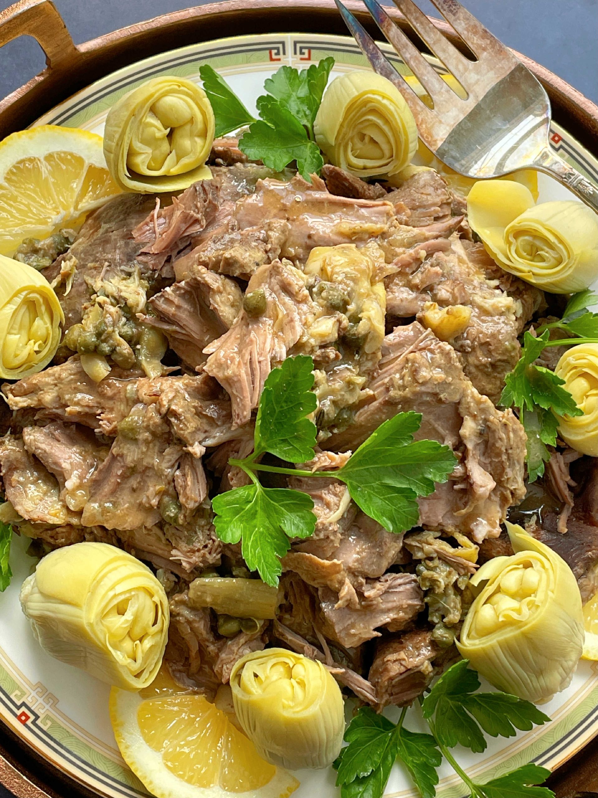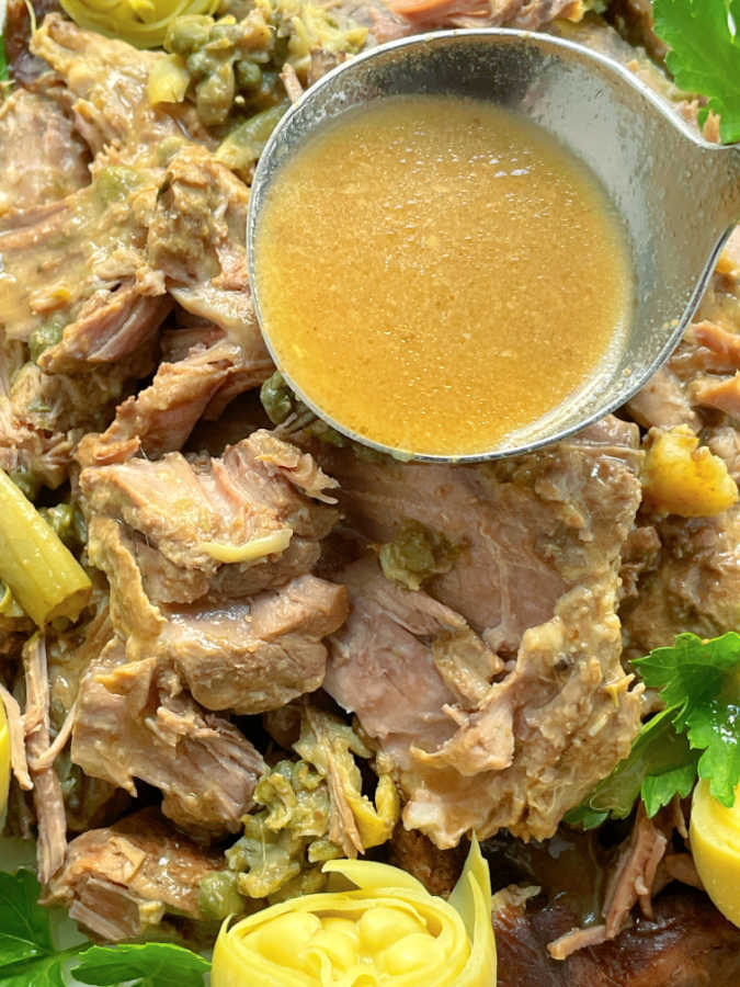 I made my lamb one day in advance before photographing. My shoulder was pretty fatty, so I wanted to remove some of that fat from my gravy before serving. This is an optional step and dependent on your personal preference. I removed the meat, artichokes and capers into a bowl, covered it with plastic wrap and stored it in the refrigerator overnight.