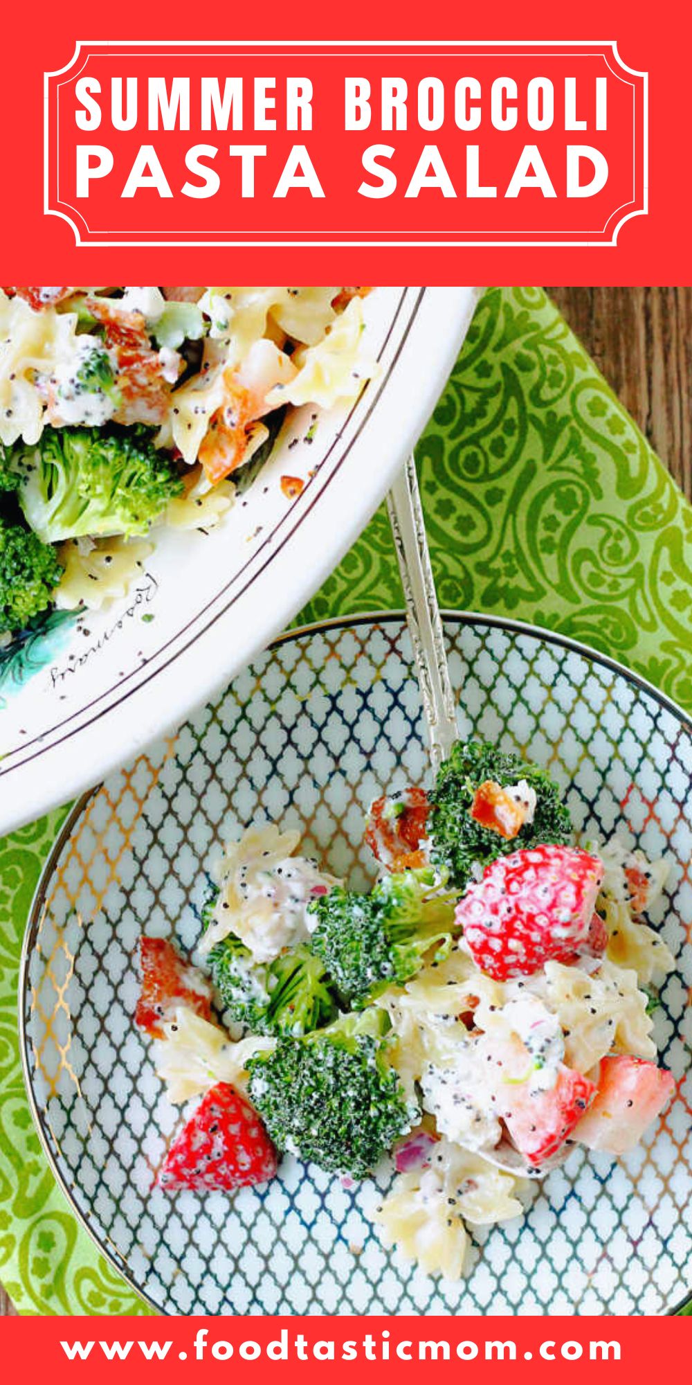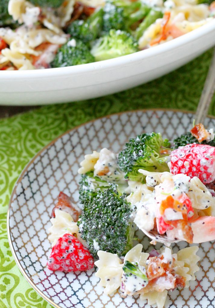 Summer Broccoli Pasta Salad is a terrific take-along dish with a perfect balance of sweet and savory flavors including strawberries and bacon.