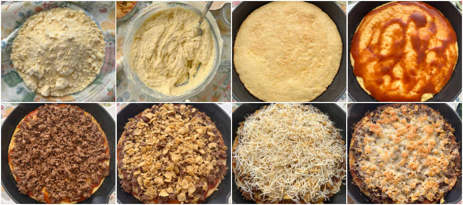 Gently spread the prepared corn bread crust into the bottom of the skillet. Bake for 15 minutes, until light golden brown. Allow to rest for 5 minutes. Then proceed with the toppings.